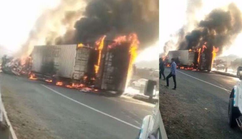 गणपति घाट में दुर्घटना के बाद 3 वाहनों में लगी आग, 2 लोगों के जिंदा जलने की आशंका